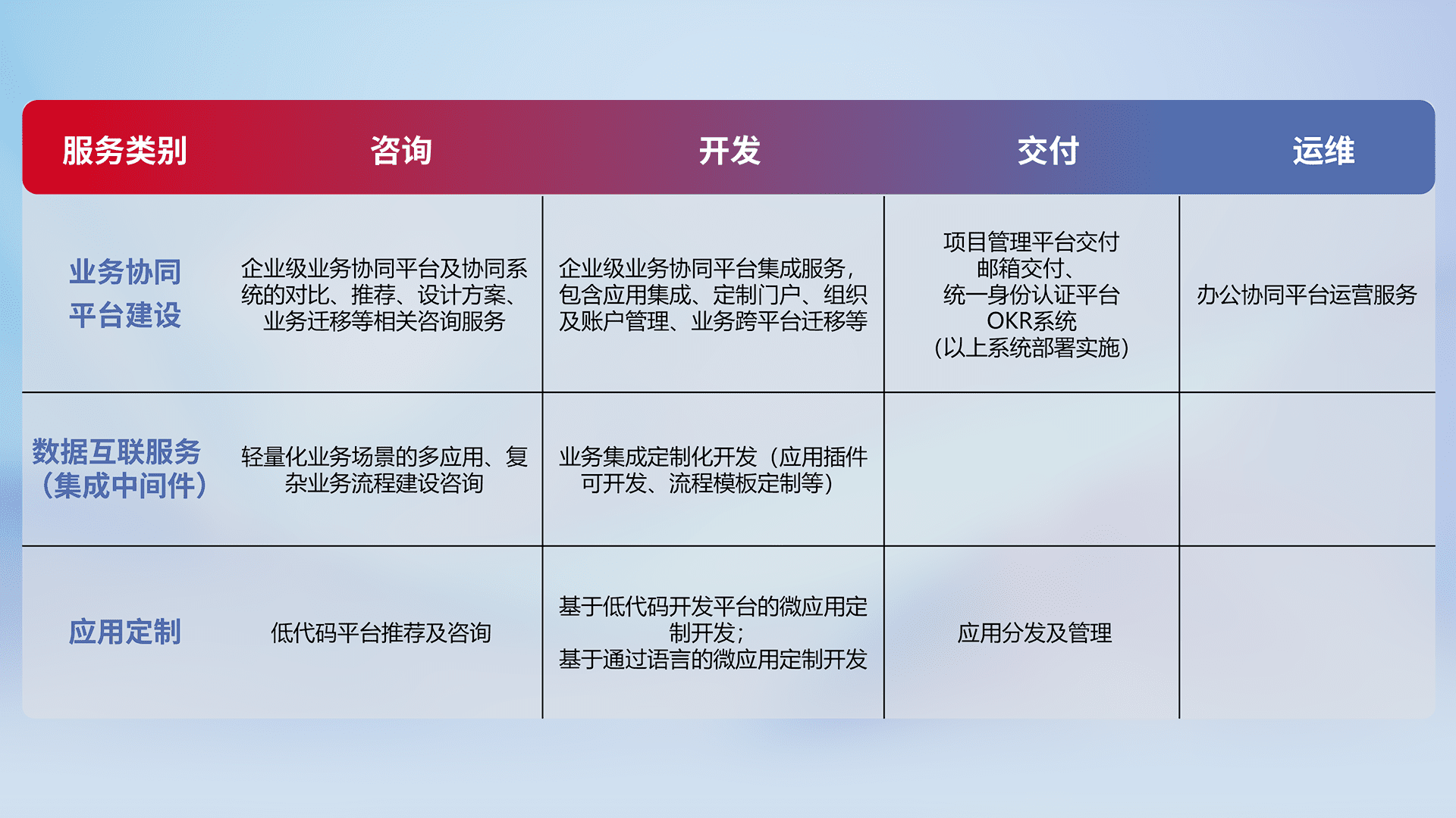 针对钉钉、、、、企微、、、、IDaas等平台级产品提供产品的规划、、、方案、、、、交付、、定制化开发等服务,,实现如统一协同办公、、智能客户服务、、、、混合会议管理、、智能数据查询、、、、等业务场景,,,实现数字化转型。。。