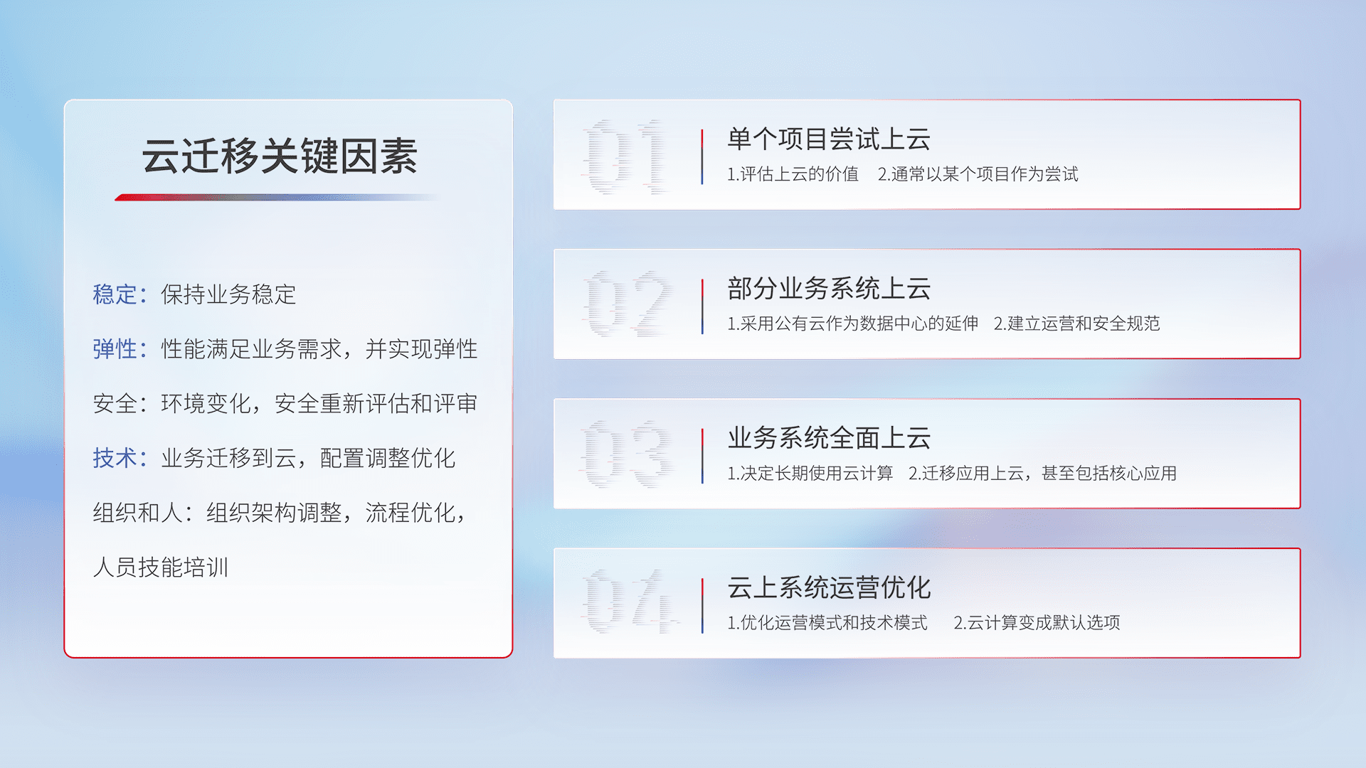 结合实际业务,,从规划设计、、云平台选型、、、、云原生改造、、、、数据迁移、、、集成交付,,,迁移全过程为客户识别最佳上云路径,,,,做好风险识别管理,,设计网络架构、、、、身份权限、、、安全审计合规、、、、操作审计、、、日志审计、、、、监控告警策略、、、、多站点容灾设计等,,对云上基础设施进行整体规划,,提升IT治理水平,,,,以满足弹性、、、、高可用、、高性能的需求。。